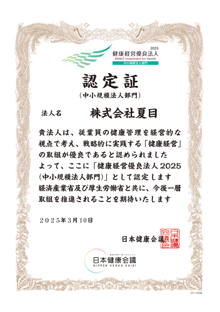 今年も健康優良法人に認定されました。弊社では社員の健康は会社の財産として捉え、社員一人ひとりが健康で活き活きと働ける環境づくりを目指しています。社員及びご家族の心身の健康維持や、団地内外の健康イベントへの参加等を通じて地域に
